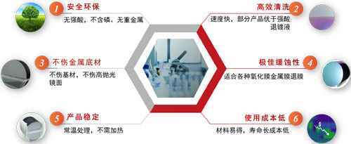 晶圆硅片退镀液是一种用于晶圆硅片镀膜不良返工退镀的环保产品;产品由有机酸、促进剂、剥离剂等组成,不含氢氟酸、盐酸、硫酸、硝酸等传统无机强酸,无刺激性气味,对人体较为安全;使用时无酸雾污染、无磷、无重金属污染;产品温和不伤手,无色轻微气味,无酸雾挥发,适合各种氧化膜金属膜退膜,还原镀膜前素材状态;产品常温处理不需加热,不伤基材,不伤硅片高抛光镜面;退膜速度快,速度接近无机强酸退膜速度,材料易得,成本低,使用寿命长。